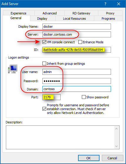 5. Input username, password, domain of Hyper-V host. Not the virtual machine.